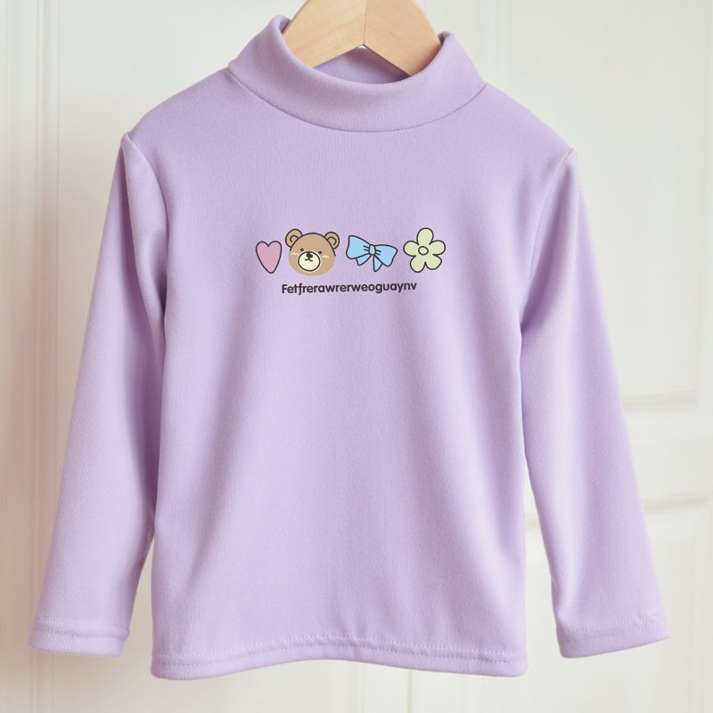 Girls' cute long-sleeved warm turtleneck solid color top - cute casual cartoon print, warm and comfortable winter shirt