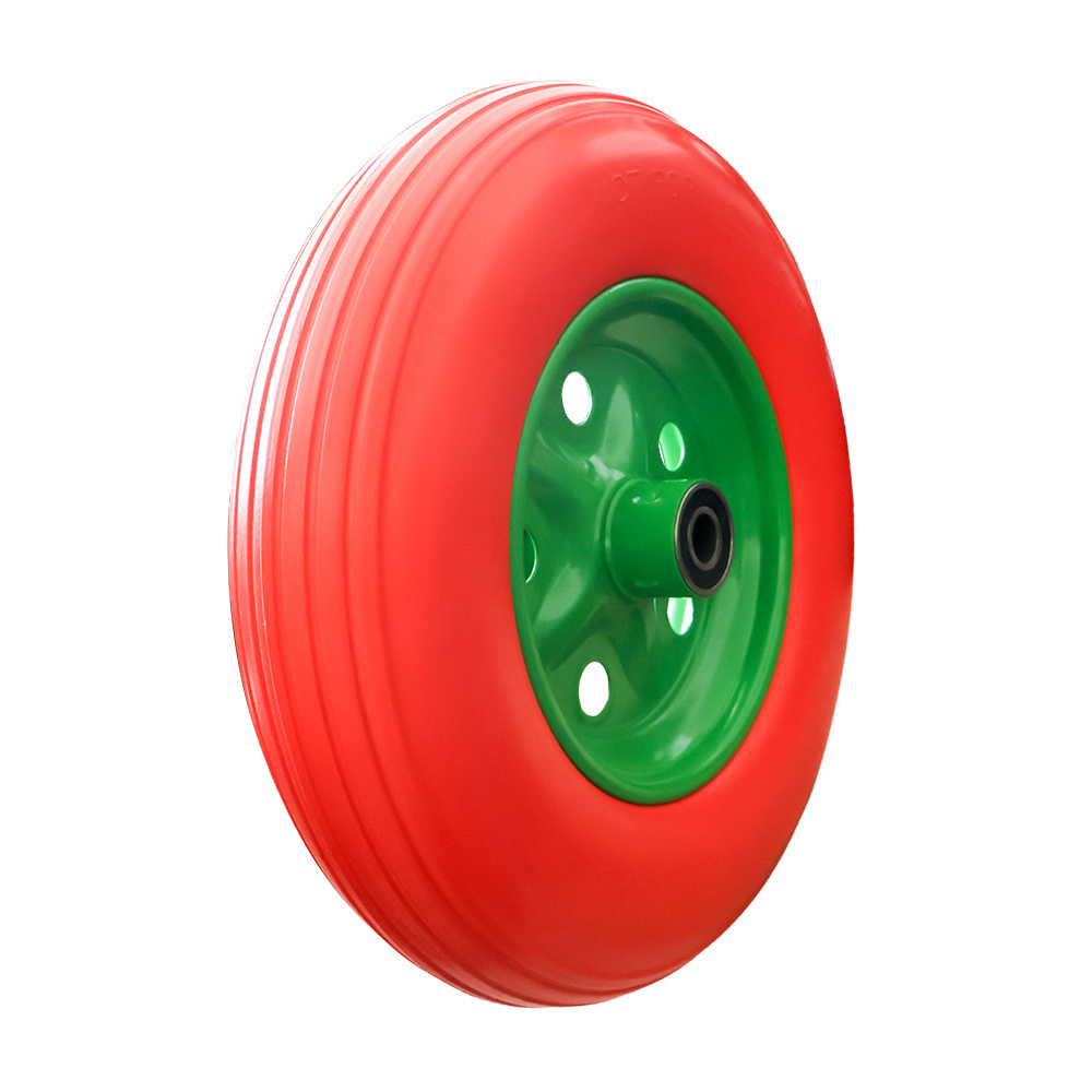 A PU flat-free wheel is a puncture-proof wheel made of polyurethane (PU) material. It is designed to be durable and