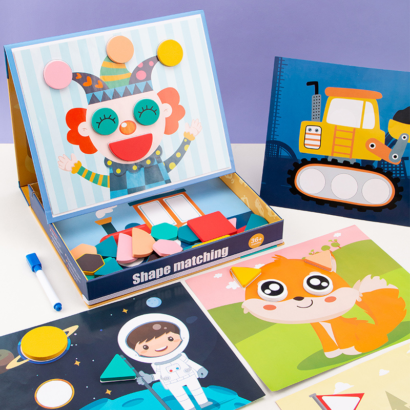 montessori cartoon scene card 3d wooden magnetic puzzle game book toy with drawing board