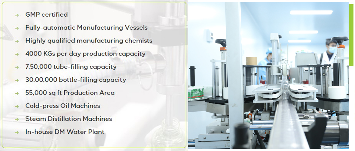 We use world-class facilities for personal care product development. Innovative machinery and tools help us in speeding up the manufacturing process. Our manufacturing unit's outstanding skill force and engineering allow us to produce high-quality items without sacrificing product safety. We safeguard the users' complete health by incorporating all preventive measures, from