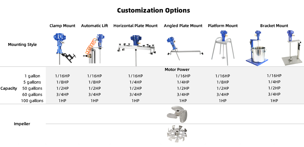 match your specific requirements. With our flexible options, you can tailor your agitator's capacity, motor power, impeller style, and mounting style.
