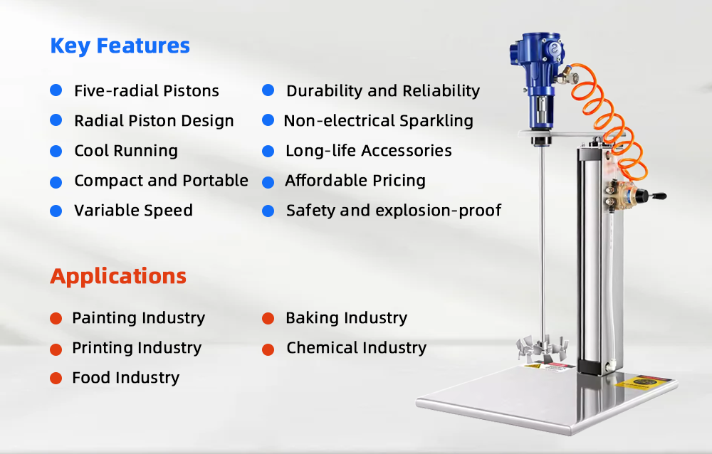 Ideal for industries like painting, coatings, chemical processing, and food production, this agitator excels in dispersed stirring and preventing sedimentation and solidification.