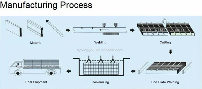 Galvanized steel grid are sturdy grids of bearing bars and crossbars. The bearing bars made from steel strip. The crossbars are pressed into the bearing bars and resistance welded at joint to ensure high rigidity.