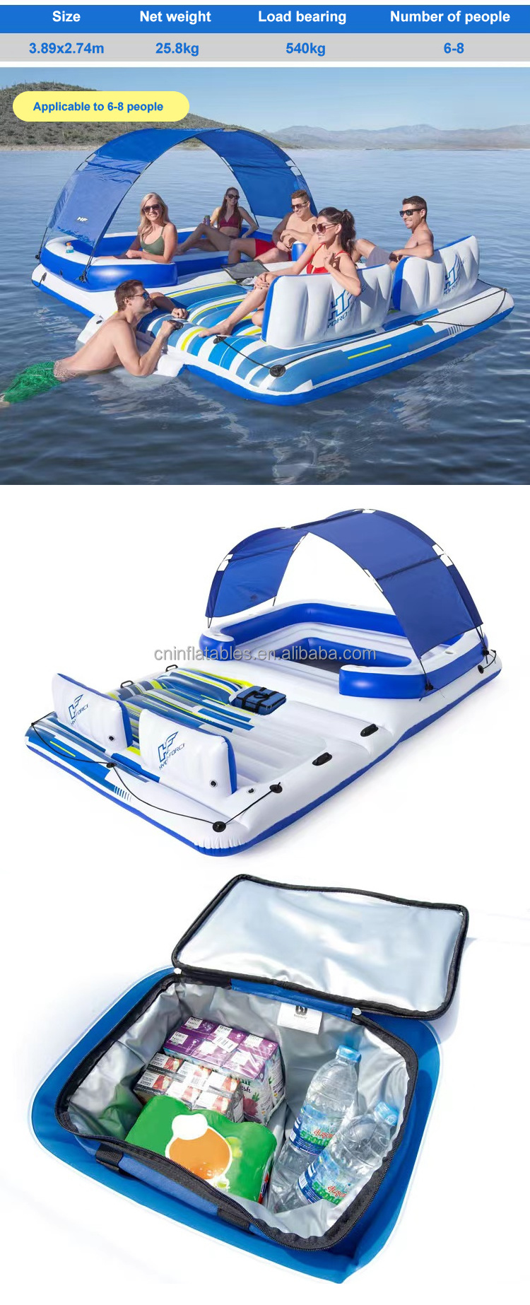 Your drinks will stay cold in the built-in coolers. Y ou have your choice of where to lounge on the float. There are inflatable seat benches with backrests, but we suggest claiming the spot up front. The ombré blue colors offer a large spot to spread out in the sun. The float is made from heavy-gauge PVC for long-term use, and there’s a boarding platform to make getting in and out of the water a breeze.