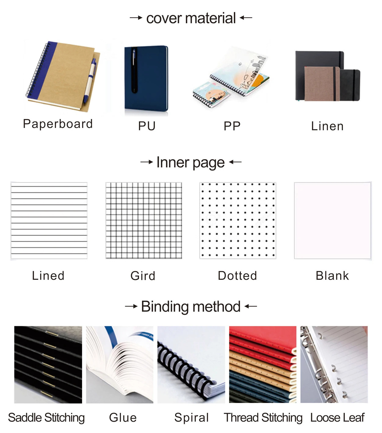 Spiral notebook: Art paper, Kraft paper, Coated paper, White or grey paper, Silver or gold card paper, Special paper etc.