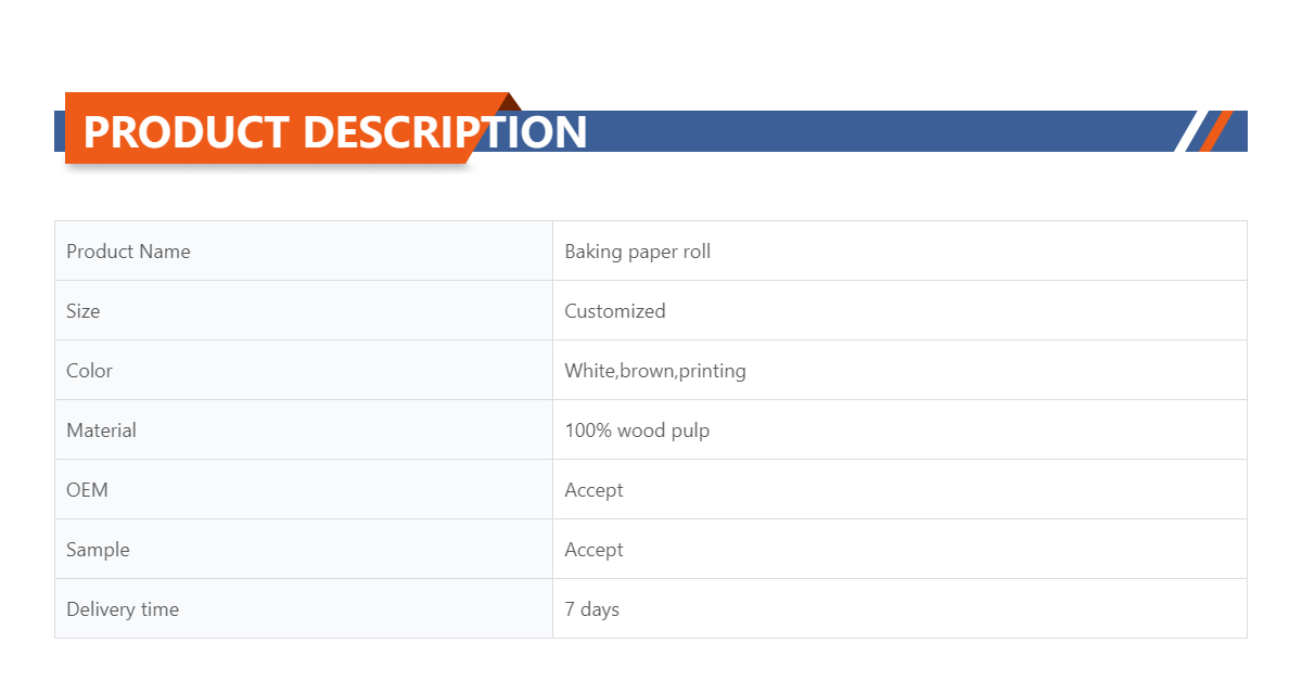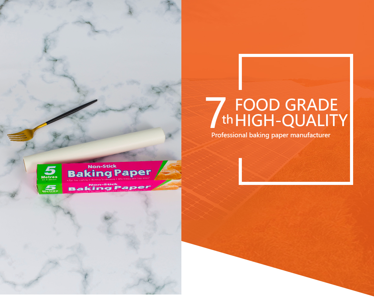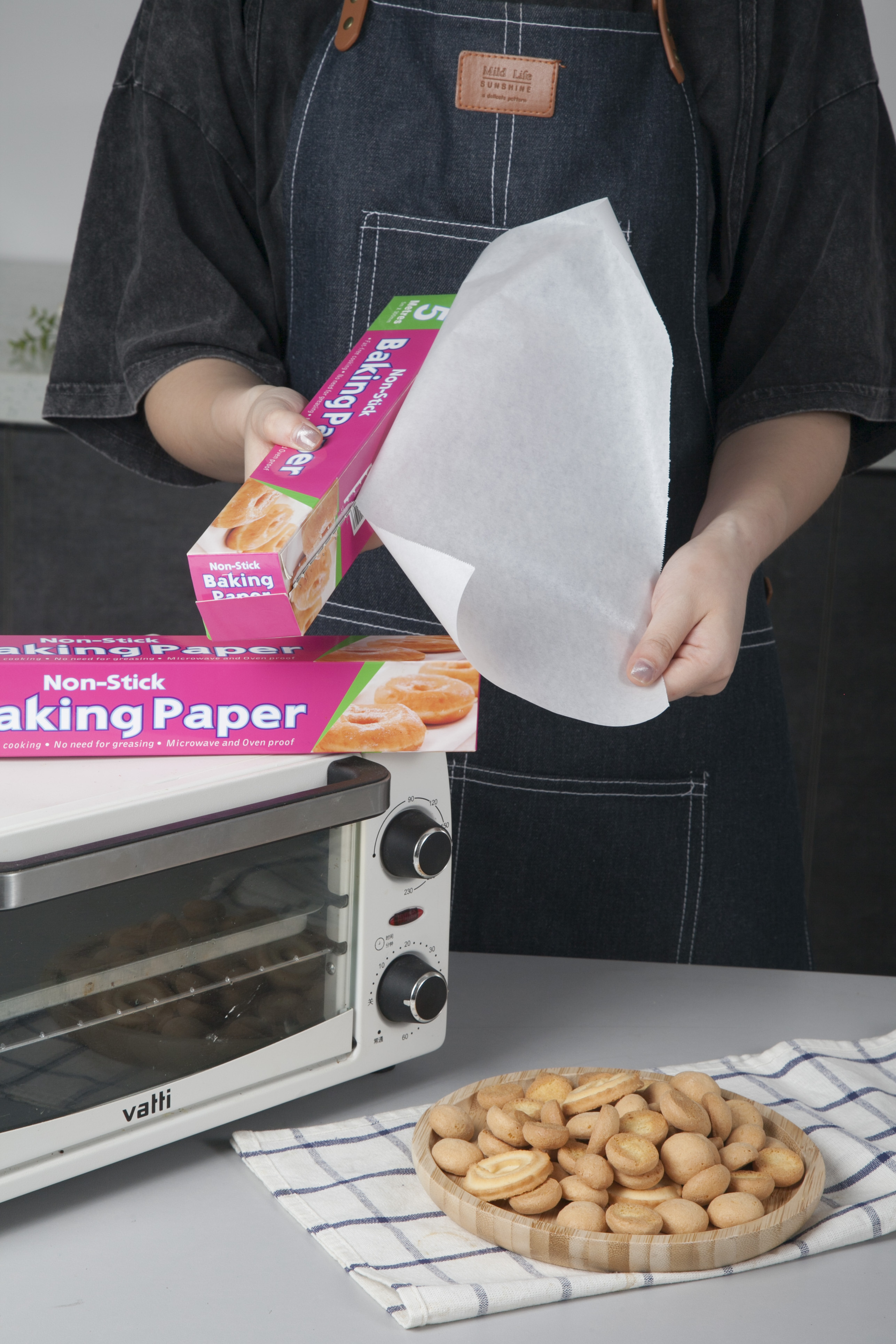 Baking paper made of 100% virgin wood pulp. Both sides are processed by food grade silicone, so that it is oilproof,waterproof, non-stick and against high temperature to 230℃.