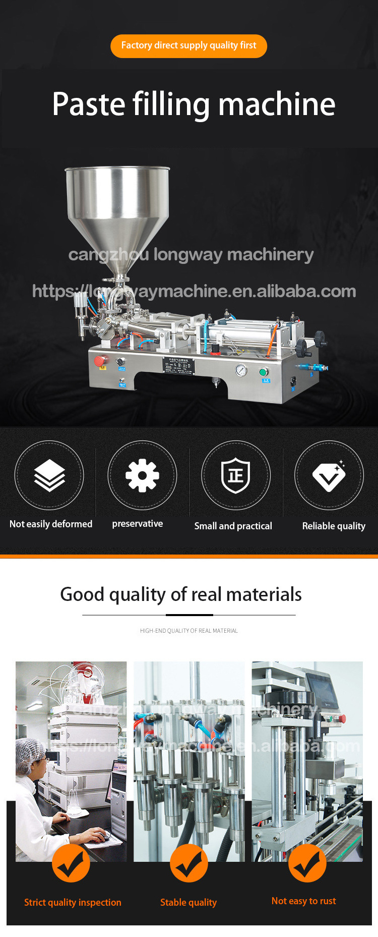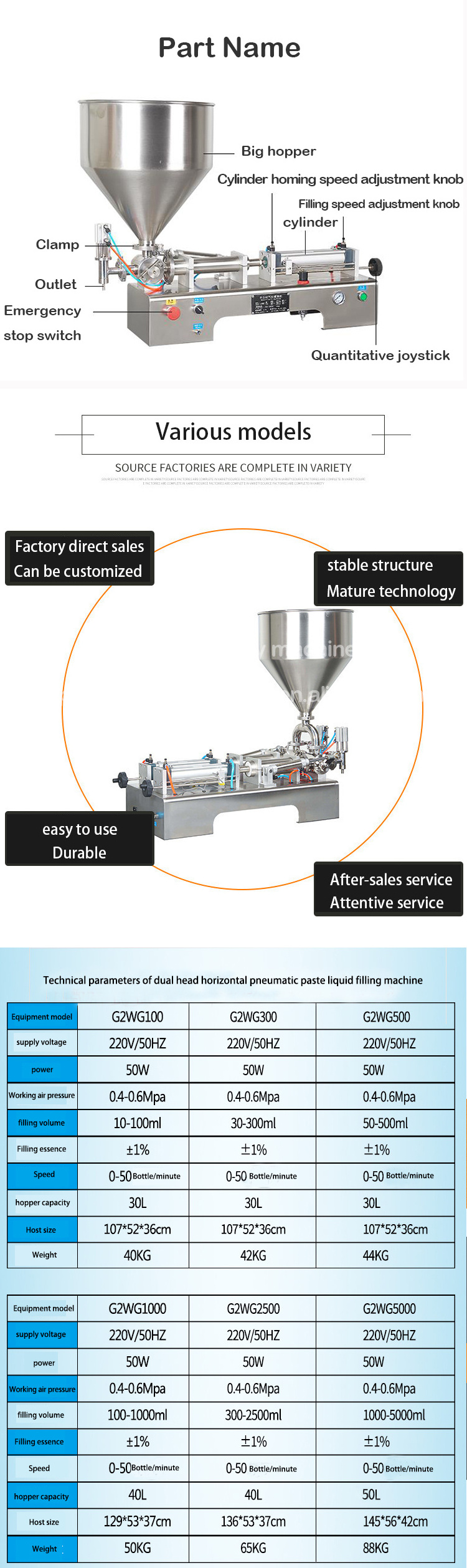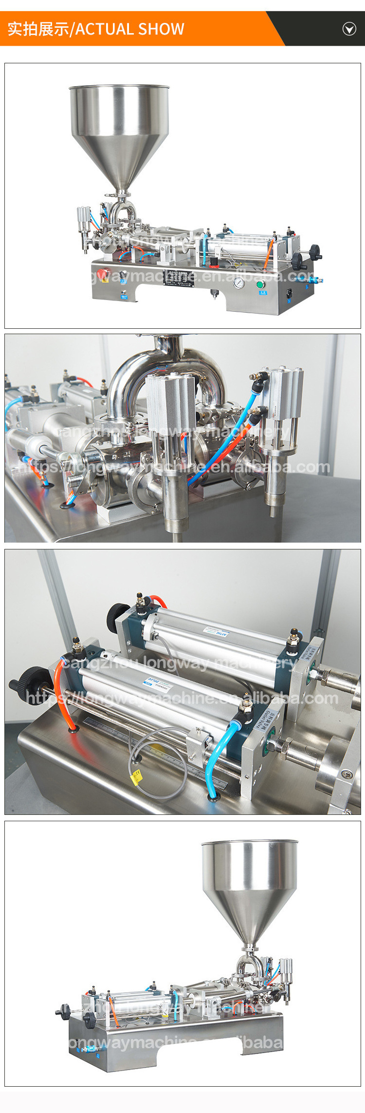 semi-automatic filling machine piston filler. Driven by a cylinder and piston made from materials with FIVE-way valves control the flow of materials, and magnetic reed switch control cylinder itinerary can be regulated filling volume.