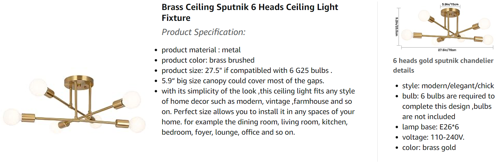 ● Brass gold finished with sturdy metal , high quality lighting fixture.