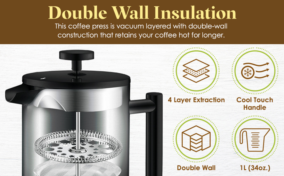 ✔ High Quality Double Wall Stainless Steel: The high-quality French press tea and coffee brewer 12 oz (350 ml) coffee pot is made from high-quality 18/10 stainless steel . The doubled walled, insulated pot will keep your coffee or tea hot for up to 2 hours.
