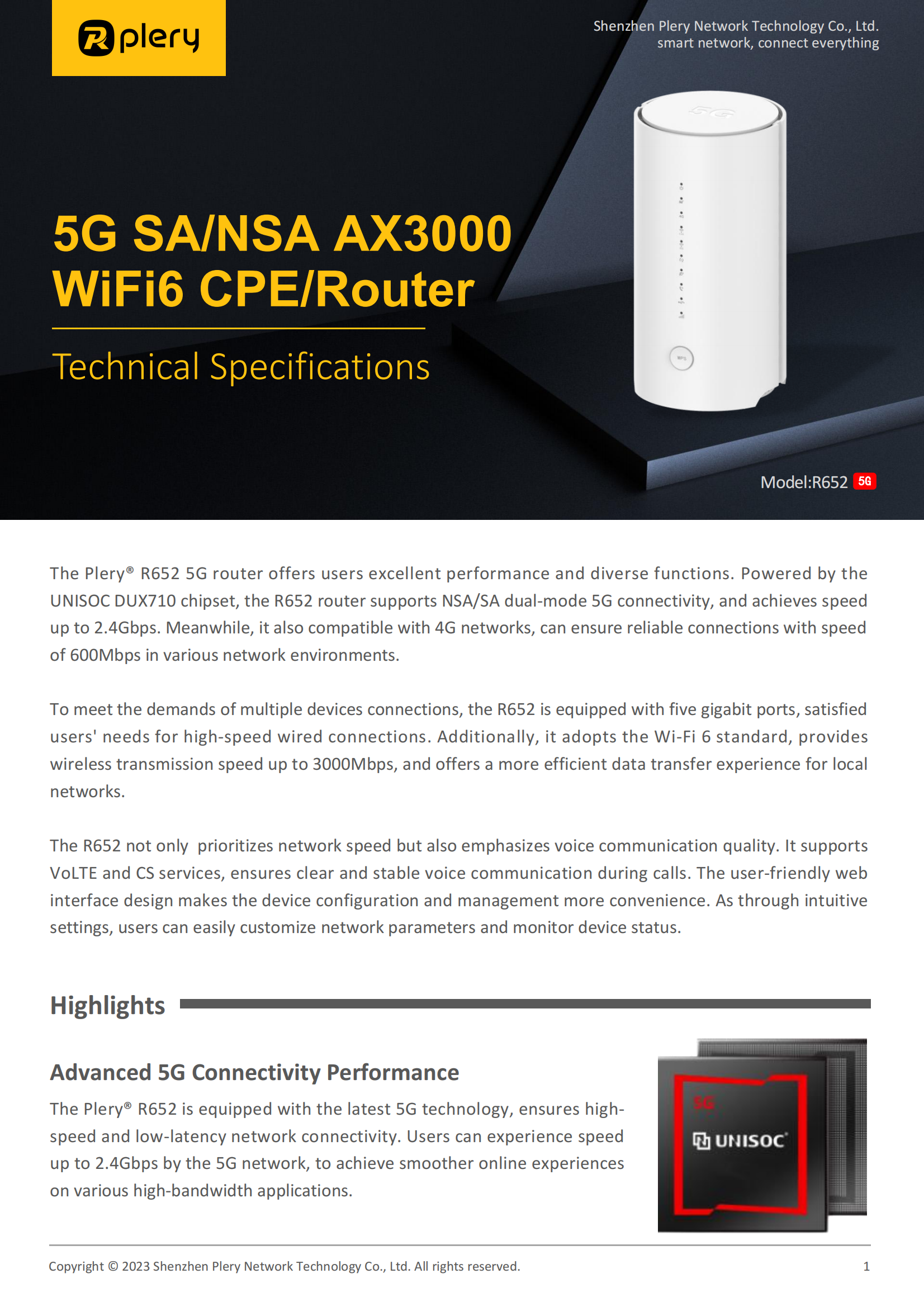UNISOC DUX710 chipset, the R652 router supports NSA/SA dual-mode 5G connectivity, and achieves speed
