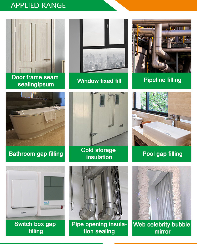 A one-component product, moisture curing and multi-purpose, It has high expansibility and cohesiveness, low thermal conductivity, low water absorption, high insulation and ther characteristics.And it has a good waterproof, thermal insulation, sound insulation, heat preservation, seismic resistant and constraction resistant function etc. This product meet with the Montreal environmental agreements, 100% do not contain Freon.