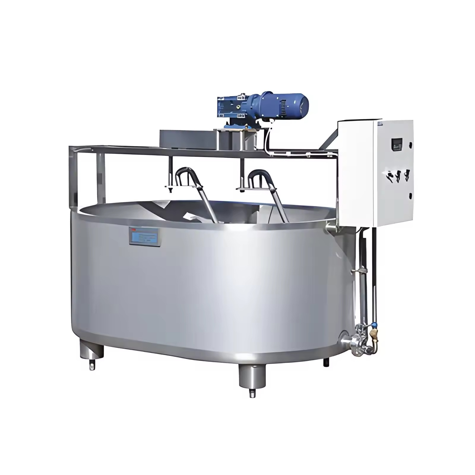 Cheese Vat is composed of main body, motor, mixing and cutting agitators, control box, etc. It can used for mixing ingredients,milk solidification, whey cutting, heating and cooling. The cheese milk is pretreated, after addition of a bacteria culture appropriate to the type of cheese, and mixed with rennet. The enzyme activity of the rennet causes the milk to coagulate to a solid gel known as coagulum. This is cut with special cutting tools into small cubes of the desired size to facilitate expulsion of whey. During the rest of the curd making process the bacteria grow and form lactic acid, and the curd grains are subjected to mechanical treatment with stirring tools, while at the same time the curd is heated according to a preset program. The combined effect of these three actions – growth of bacteria, mechanical treatment and heat treatment – results in syneresis, i.e.separation of whey from the curd grains. The finished curd is placed in cheese moulds, which determine the shape of the finished cheese. The cheese is pressed, either by its own weight or by applying pressure to the moulds. Finally, the cheese is coated,wrapped or packed. Most kinds of cheese will ripened in the ripening room for deferent period.