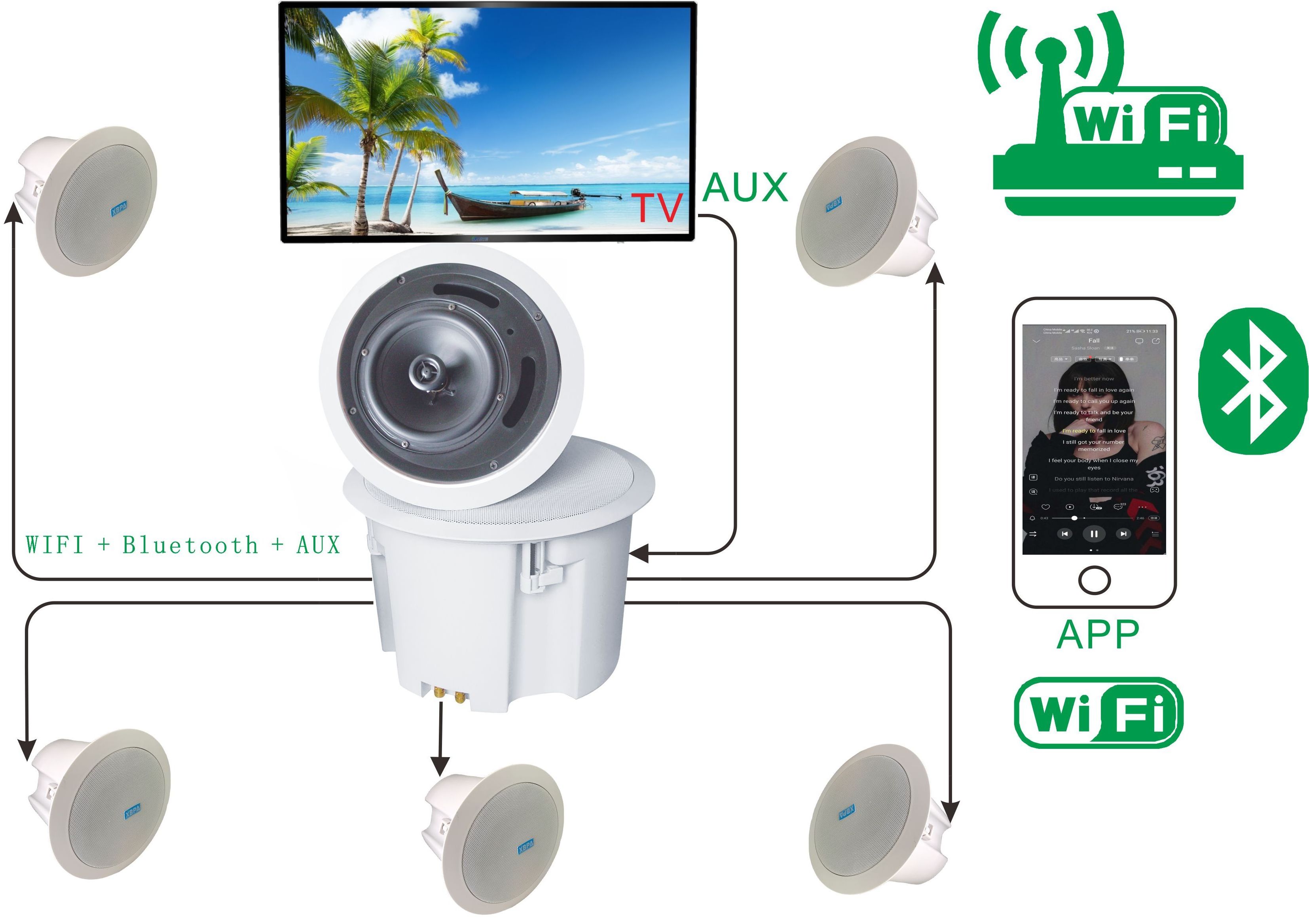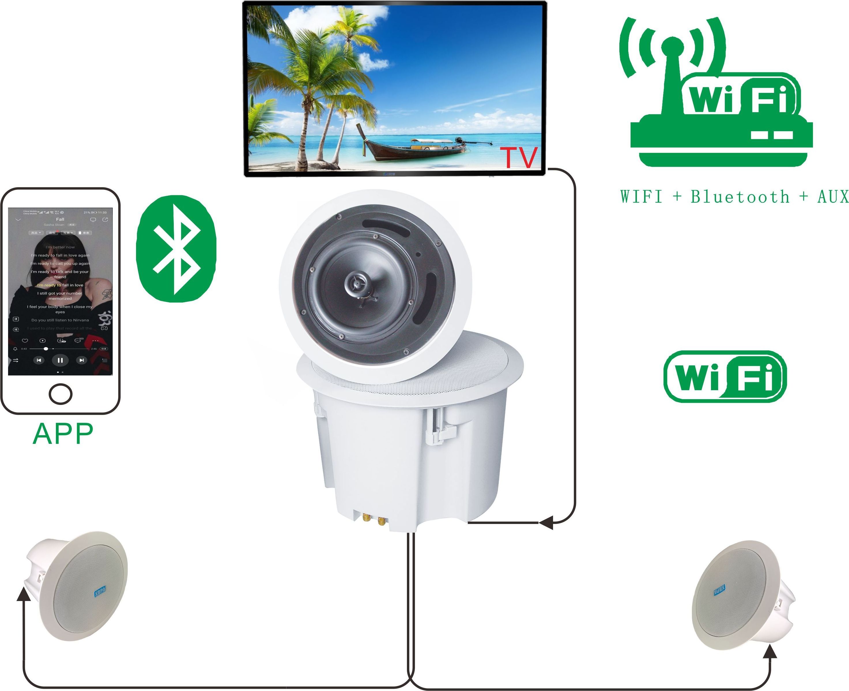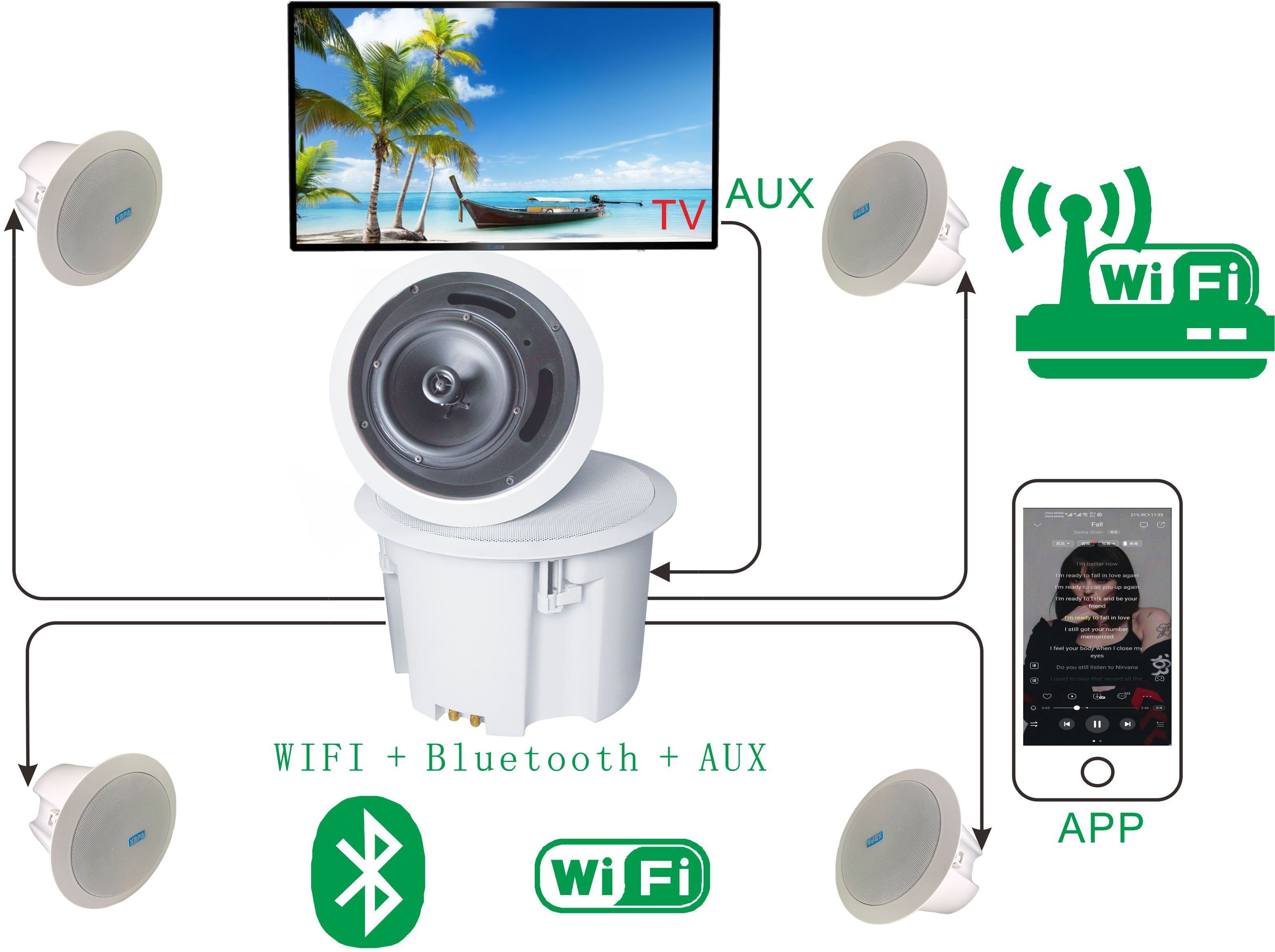 Hi-fi coaxial WIFI wireless ceiling speaker with bass unit. Woofer unit 6 "60W. The heat unit of the stereo speaker is 5 "30W. A WIFI speaker that transmits wireless audio data over a home network. (you can connect to the WIFI speaker via the RJ45 network cable. WIFI can also be connected directly to the speaker). High fidelity 2.1 speaker system is designed based on wireless LAN, aiming to provide customers with high efficiency, high quality, high stability stereo wireless transmission ceiling speaker. Built-in digital power amplifier, using stable and effective D class digital amplifier chip, output stereo 30W, bass unit 60W. Customers only need to connect the speakers to the wireless LAN, can quickly achieve music wireless transmission, enjoy the fun of wireless music. The Wifi speaker comes with a mobile phone APP. A mobile phone APP can control 10 Wifi speakers. Each Wifi speaker receives different audio signals at the same time. WIFI speaker can set alarm clock to play custom music.