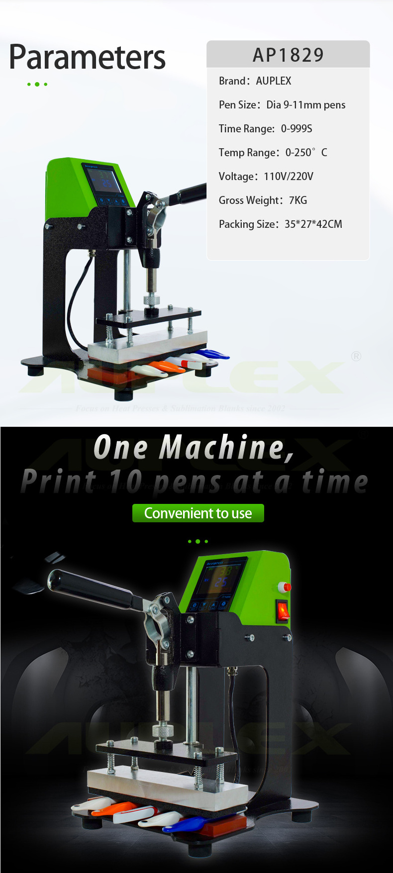 SPECIFICATIONS FOR AP1829 PEN HEAT PRESS MACHINE