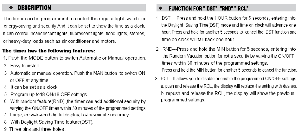 | Program Per Week | 18 ON/OFF |