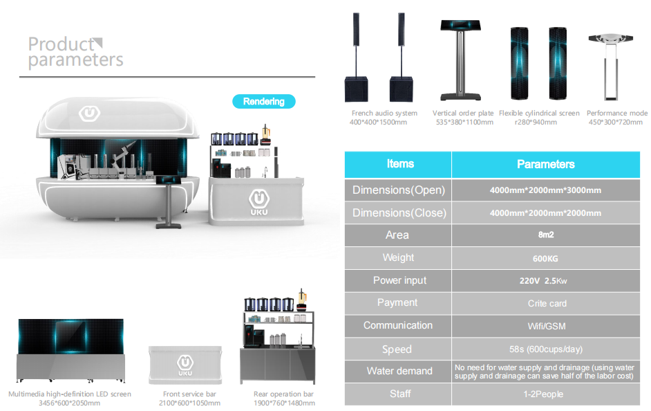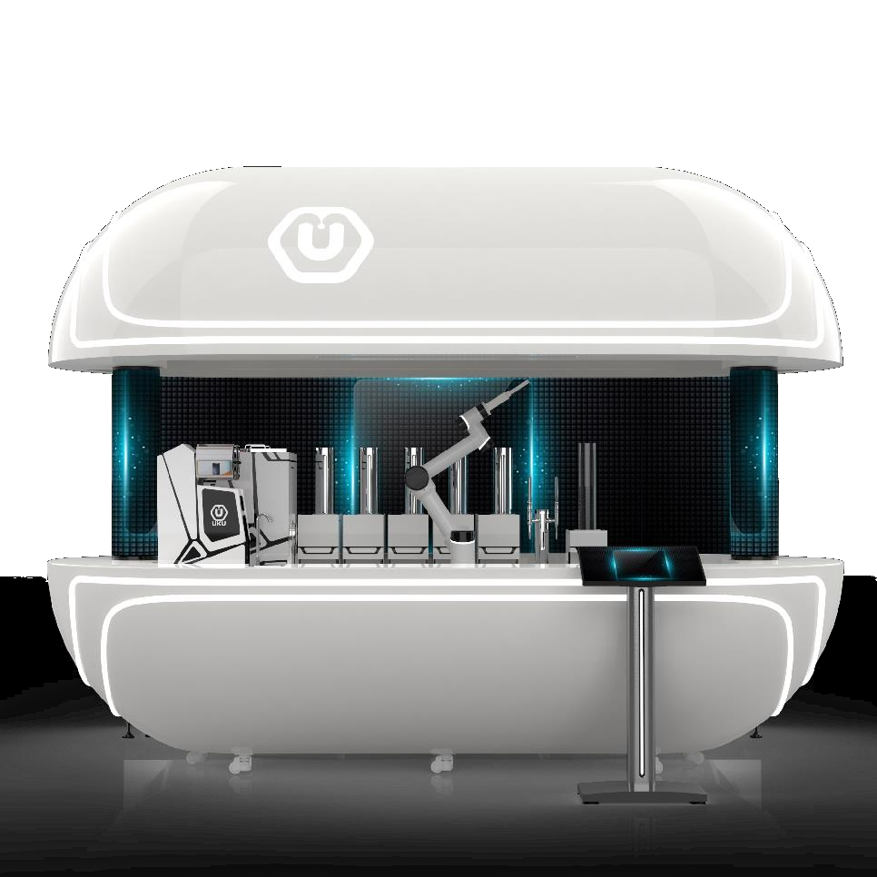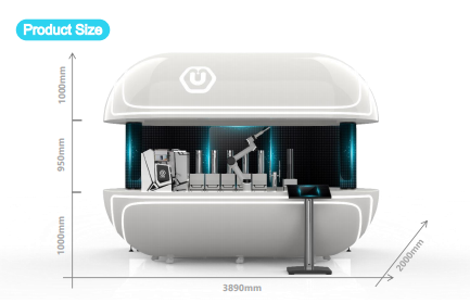 A better shopping experience, watching the robot production process up close, with a more upscale and textured overall sensory experience. Suitable for 5-star hotels, airports, high-end office buildings, high-end hospitals, clubs, and other scenarios, it can also be used as a supporting or upgrading for existing stores. Deployment is relatively convenient (about 6 hours for assembly and testing), with modular assembly and transportation.