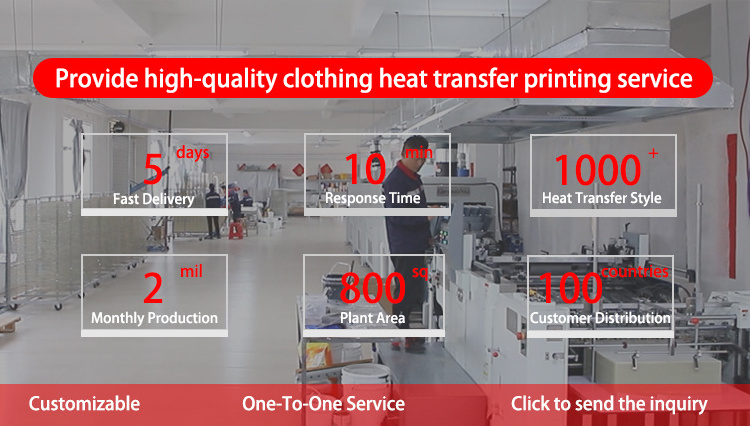 We have more than 10 years of experience in the heat transfer industry. Our factory has 800+ square meters, with automatic machines and semi-automatic machines, which can meet the production needs of different heat transfer products. The monthly output exceeds 2 million. In addition, we provide one-stop heat transfer solutions.